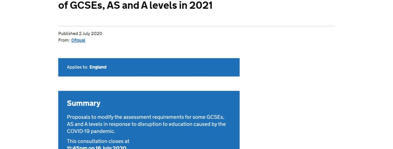 Summary Proposals to modify the assessment requirements for some GCSEs, AS and A levels in response to disruption to education caused by the COVID-19 pandemic. This consultation closes at11:45pm on 16 July 2020 Consultation description We are consulting on proposed changes to the way some GCSEs, AS and A levels we regulate should be examined … Continue reading Proposed changes to the assessment of GCSEs, AS and A levels in 2021